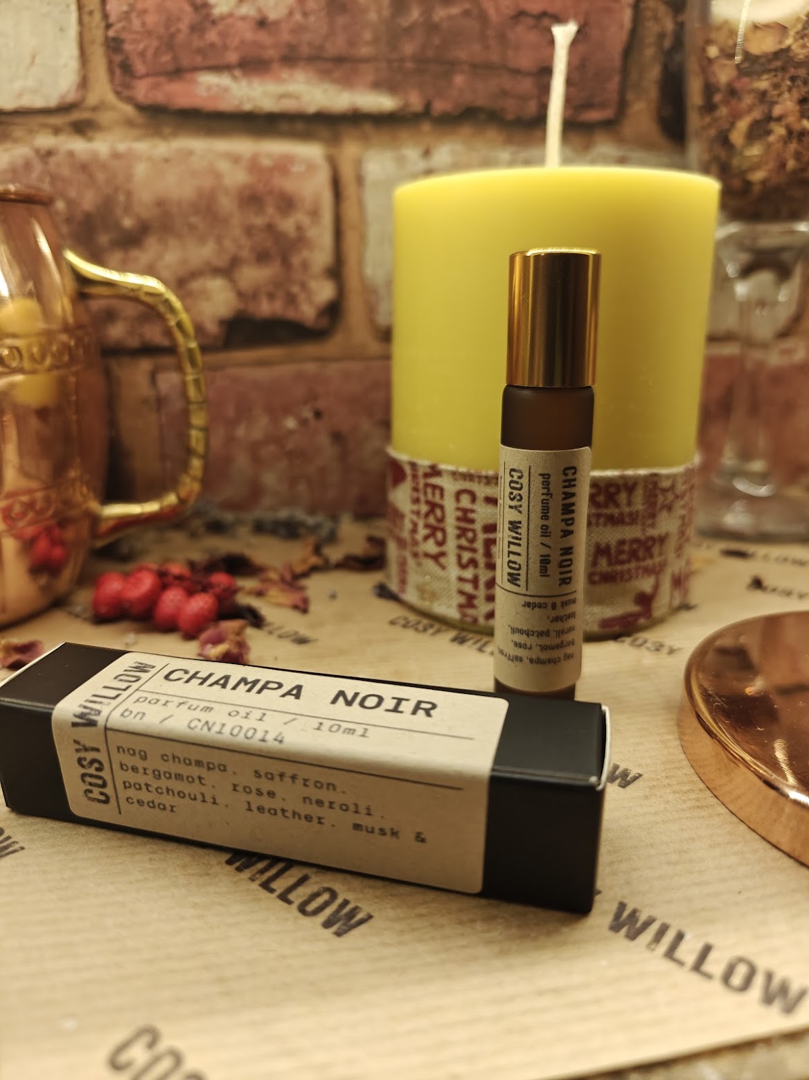 Warm, soft, and quietly grounding, Champa Noir brings the comforting haze of incense with a whisper of earthy sweetness. Rose adds a gentle floral lift, while hints of leather give the blend a smooth, worn-in warmth — like sunlight on old wood and the familiar scent of well-loved books.